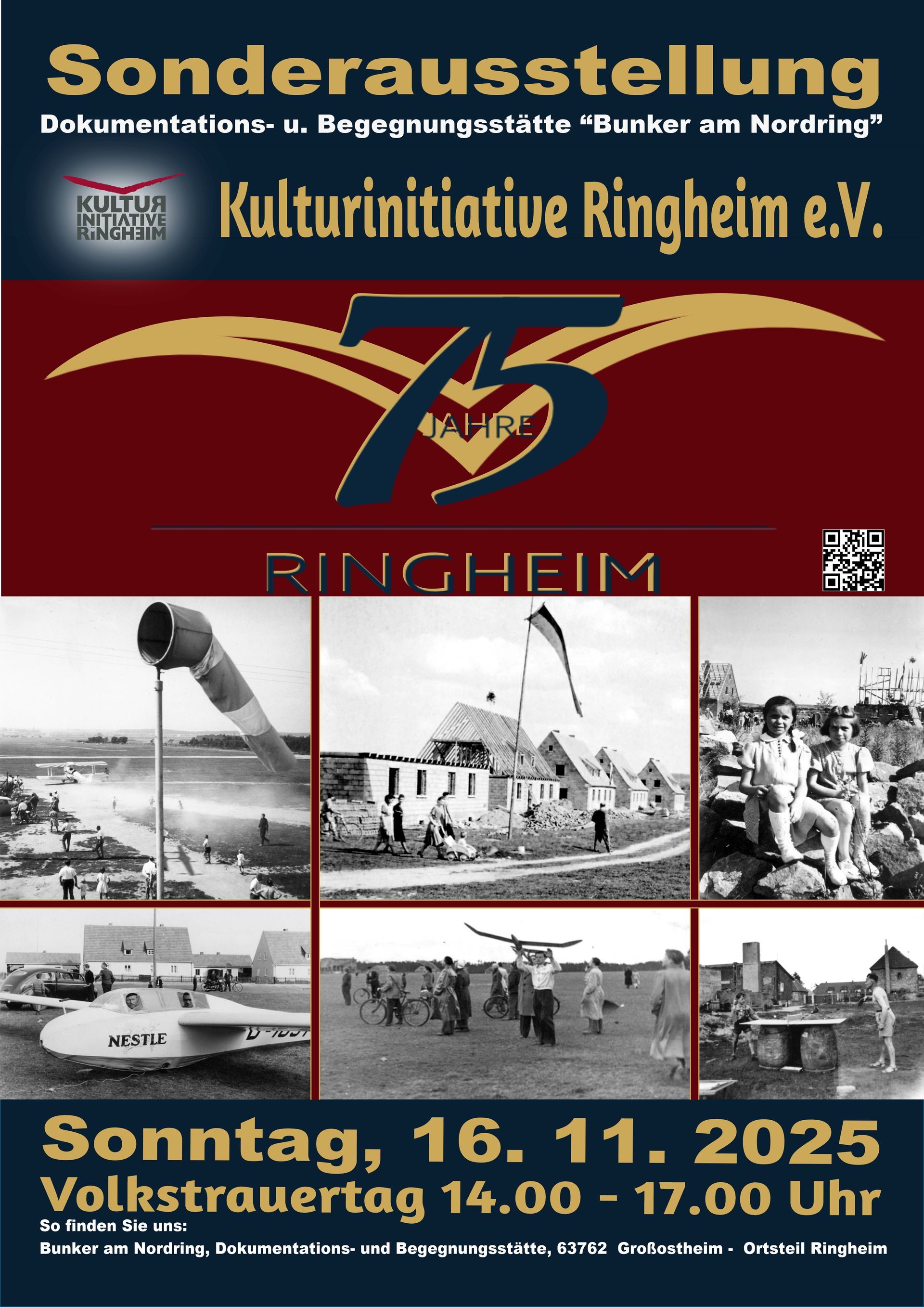Unsere drei letzten Bunkeröffnungen standen im Zeichen zu „75 Jahre Ringheim” mit jeweils weit über 100 Besuchern. Da das Interesse ungebrochen scheint, wiederholen wir die Sonderausstellung zum Volkstrauertag am 16. November 2025 noch ein letztes Mal. Die Dokumentations- u. Begegnungsstätte "Bunker am Nordring" hat von 14 bis 17 Uhr geöffnet.