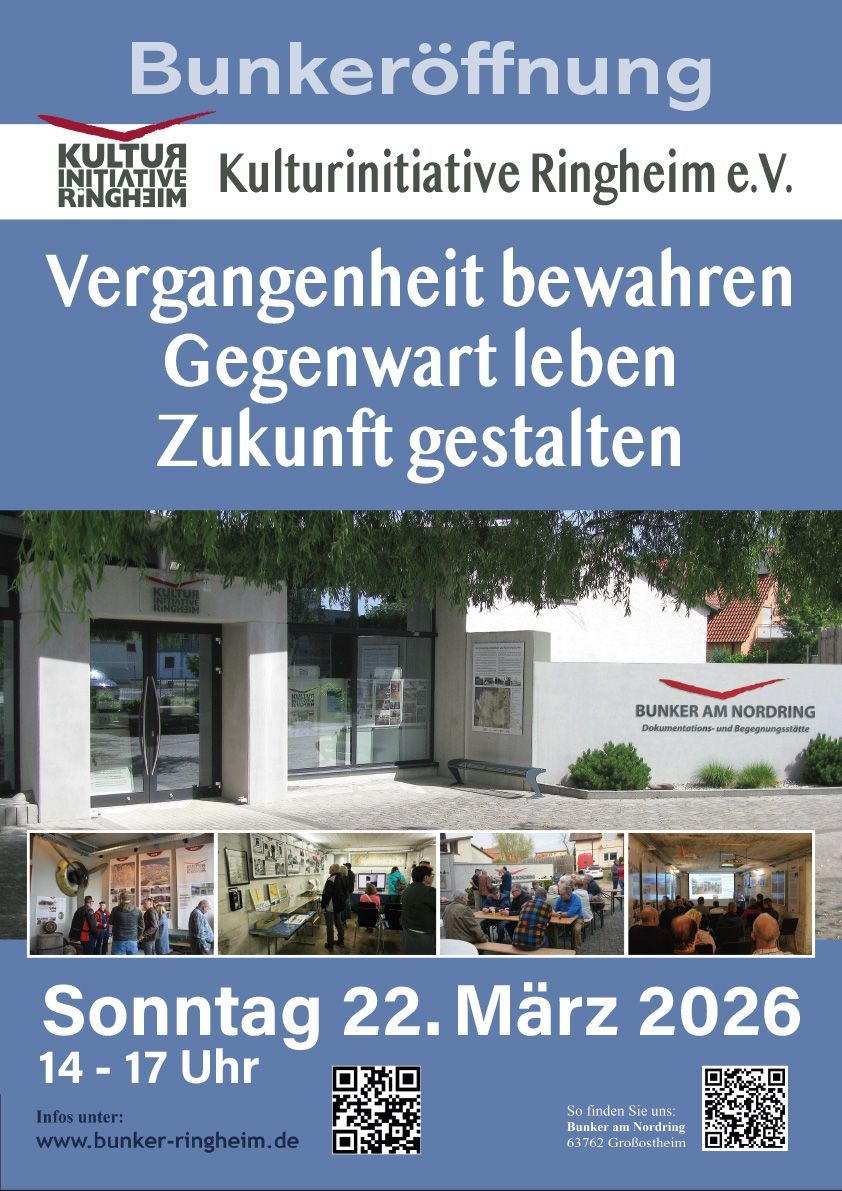 Die Dokumentations- und Begegnungsstätte „Bunker am Nordring“ in Ringheim ist am Sonntag, 22.03.2026 von 14 Uhr bis 17 Uhr wieder für Besucher geöffnet. In den Räumen eines zu Kriegszeiten errichteten Forschungsbunkers hat die Kulturinitiative Ringheim e. V. die Geschichte des ehemaligen Kriegsflugplatzes „Platz Großostheim“ und die Entstehungsgeschichte des heutigen Ortes Ringheim auf diesem Gelände dargestellt. Unter dem Motto „Vergangenheit bewahren – Gegenwart leben – Zukunft gestalten“ kann man auf Bildtafeln in Wort und Bild diese Entwicklung vom einstigen Waldgebiet über die kriegerische Nutzung bis hin zum lebendigen Ort mit Wohn- und Gewerbegebieten verfolgen. Mit ausgestellten Objekten, Dokumenten und Modellen wird dies sehr anschaulich dargestellt.